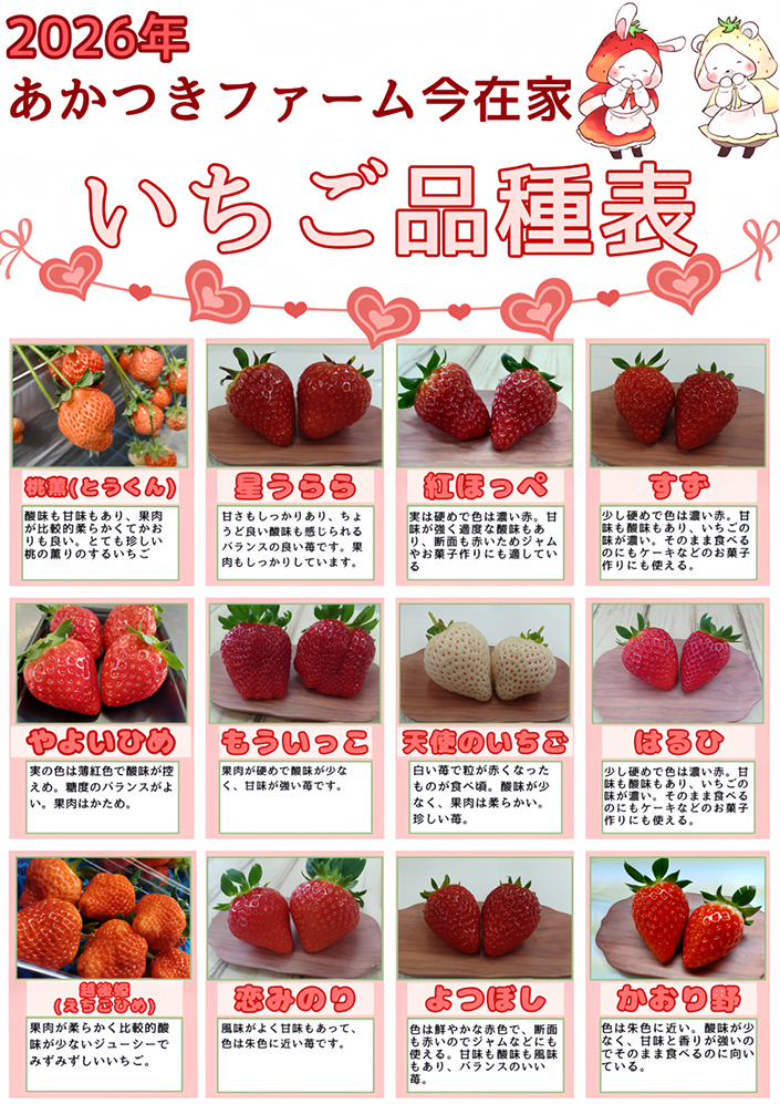| 注 意 事 項 | ・一度に大勢のお客様をお受けできないため、団体(20名以上)での入園を希望の方は、事前にご相談ください。 ・小学生以下は保護者同伴でお願いします。 ・気候や天候により実の量も変化いたします。なにとぞご了承ください。 ・練乳はハウス内で購入いただけますが持ち込みもOKです。 ・付き添いやビデオ・カメラの撮影でもハウス内に入る場合は料金が発生します。 ・中高生の方は、学生証の提示をお願いします。 学生証をお忘れの場合は、大人料金にさせていただきます。ご了承ください。 ・駐車場内での事故、盗難等につきましては一切の責任を負いません。 ・周りの迷惑になる行為はおやめください。 ・駐車場は限りがありますので、出来るだけ乗り合わせでお越しください。 |